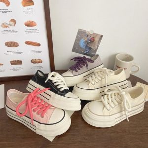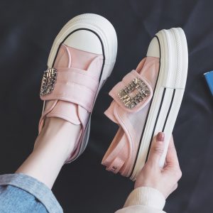 One pedal, half trawl velcro and two women wearing platform canvas shoes