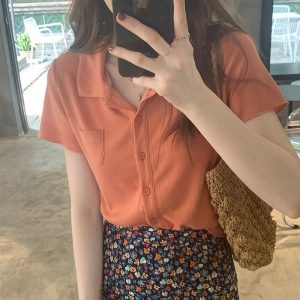Be the first to review “Polo neck striped ice silk short sleeve T-shirt women’s front shoulders”